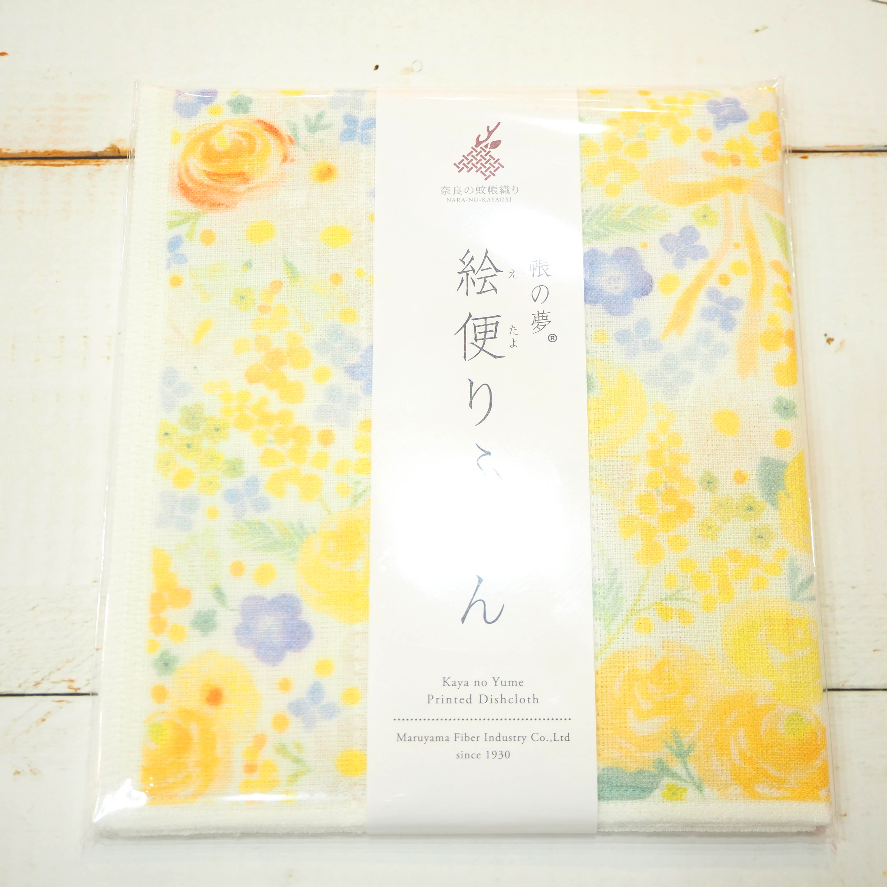 春夏秋冬のさまざまな季節の柄を散りばめた「絵便りふきん」。