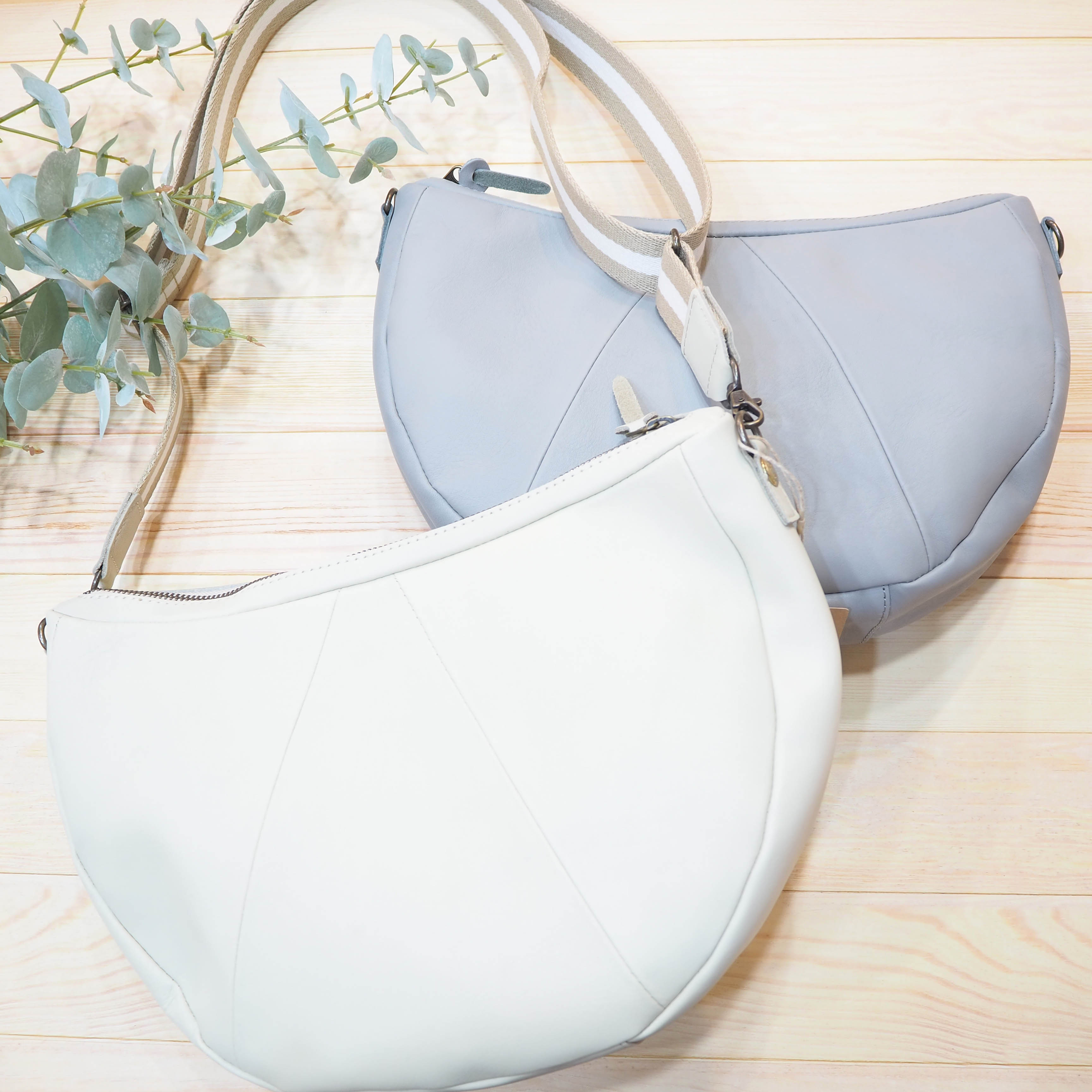 猫のハチワレ模様のようなレザーのきりかえと、アイビーテープとショルダーの組み合わせが、男性でも女性でもピタッとはまるデザイン。